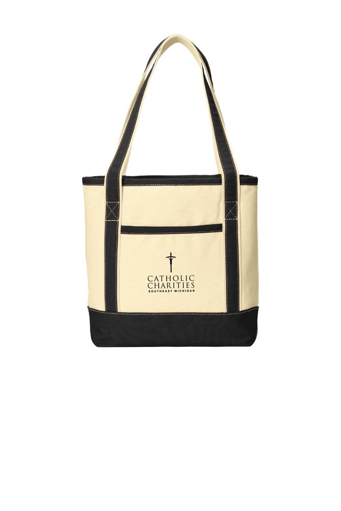 • Perfect for the beach, shopping and events, these durable totes have open tops, contrast handles and contrast bottoms for classic good looks. • 15.5-ounce, 100% cotton canvas body; 11-ounce, 100% cotton canvas handle trim and bottom • Sturdy, reinforced webbing handles • Exterior front pocket for easy decoration access • Interior hanging pocket with hook and loop closure to secure valuables • Dimensions: 13.25"h x 12"w x 6.25"d; Approx. 994 cubic inches • Note: Bags not intended for use by children 12 and under. Includes a California Prop 65 and social responsibility hangtag.